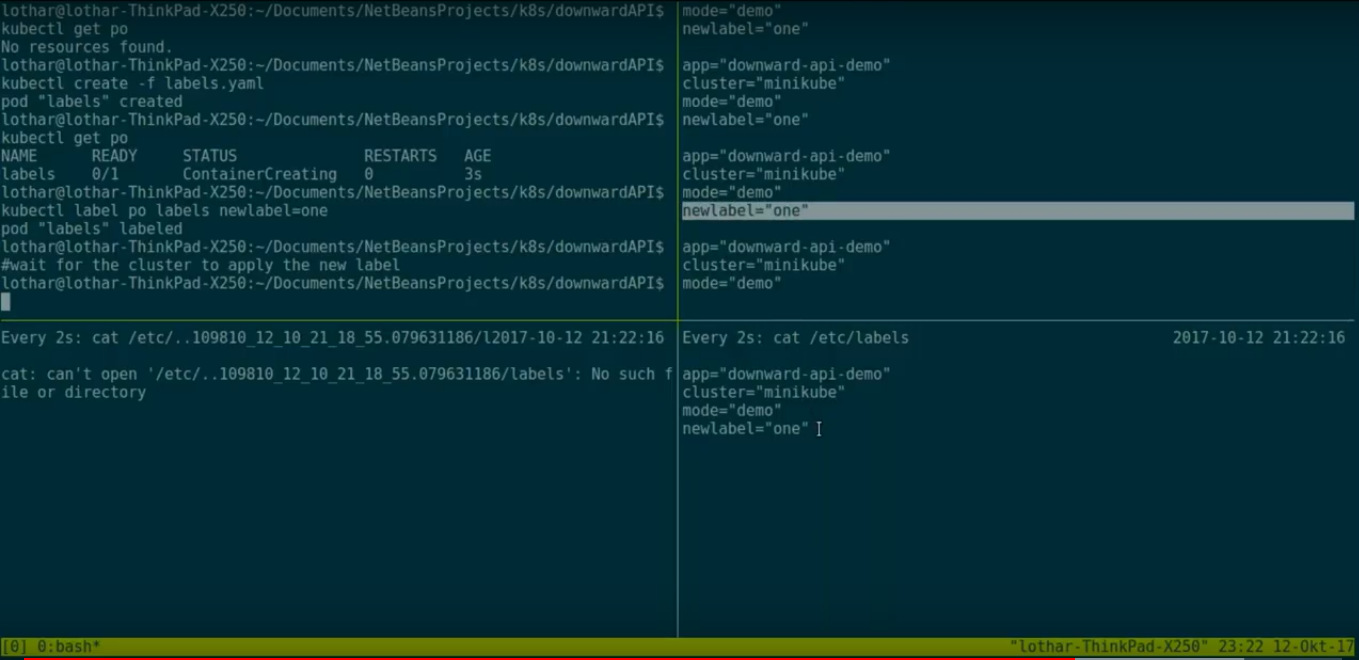 I created a pod “labels” in a minikube cluster. Once the pod is running I follow the POD logs. In two more panes I ssh’ed into the container and watch the labels file: