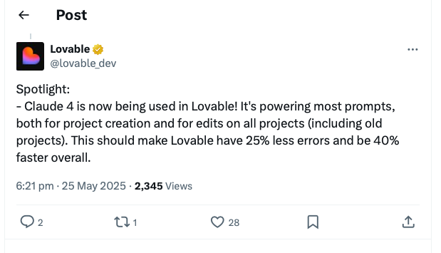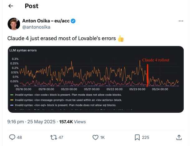 The coding platform Lovable provides concrete evidence of Claude 4’s improvements in production environments. Their deployment data shows: